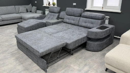 Дополнительно можно комплектовать диван стильным баром с подстаканниками, беспроводным зарядным устройством. Вместительной бар-нишей с механизмом плавного закрытия (доводчик) и бар-секретом в спи
