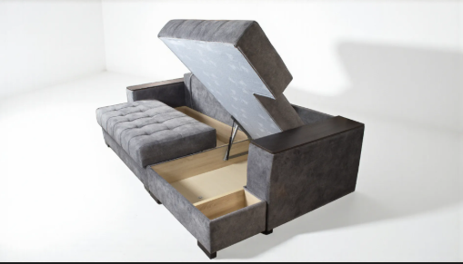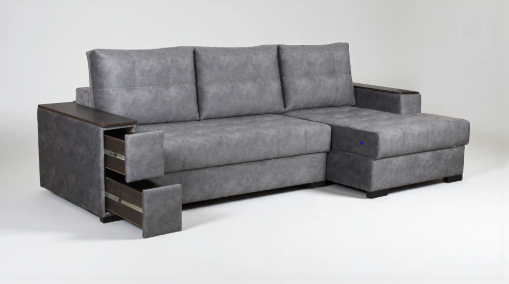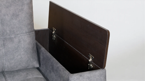 Функциональные подлокотники. Вместительный ящик-бар с одной стороны и выдвижные ящики с другой. Удобным дополнением служит практичная верхняя вставка из ЛДСП на подлокотниках.